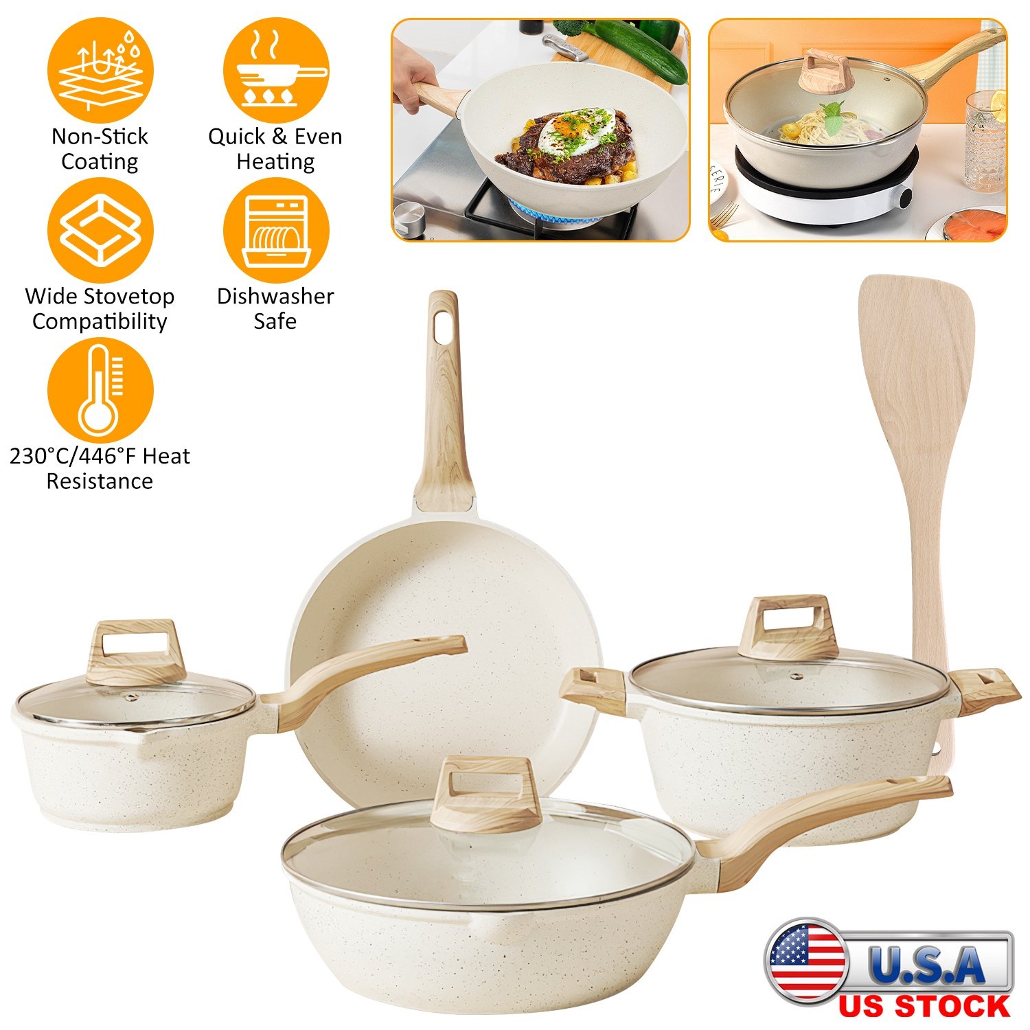 Kitchen Cookware Set Pots and Pans Set White Nonstick Granite Coating Dishwasher Safe Fast Even Heat Induction Frying Pan Stockpot Sauce Pan